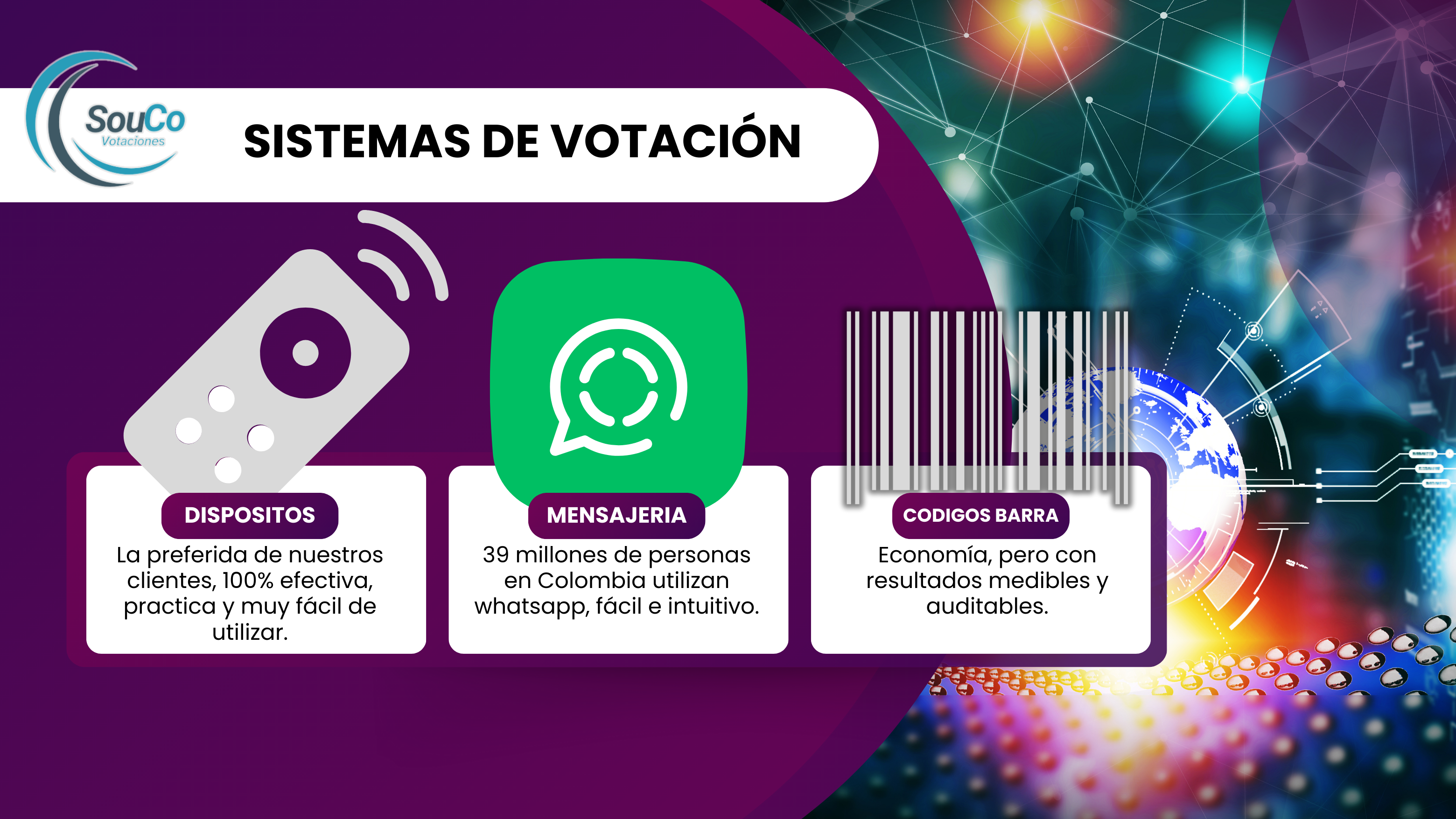 Somos una empresa dedicada a ofrecer soluciones innovadoras en sistemas de votación para eventos, asambleas y conferencias. Con un enfoque en la calidad y la eficiencia, nos comprometemos a proporcionar equipos modernos y un servicio excepcional para asegurar el éxito de cada proyecto..